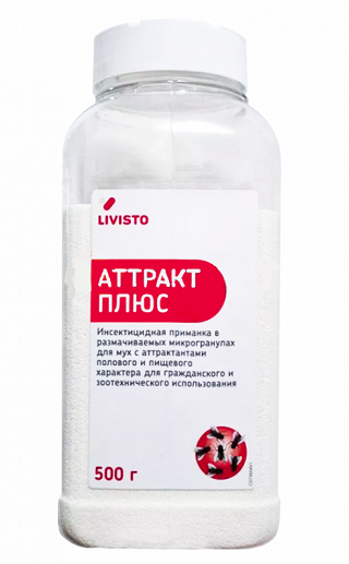 100 грамм продукта содержат: ацетамиприд 8,33;Z-9-трикозен 0,05 гр. Пищевая инсектицидная приманка в виде смачиваемых гранул с аттрактантом для борьбы с мухами.