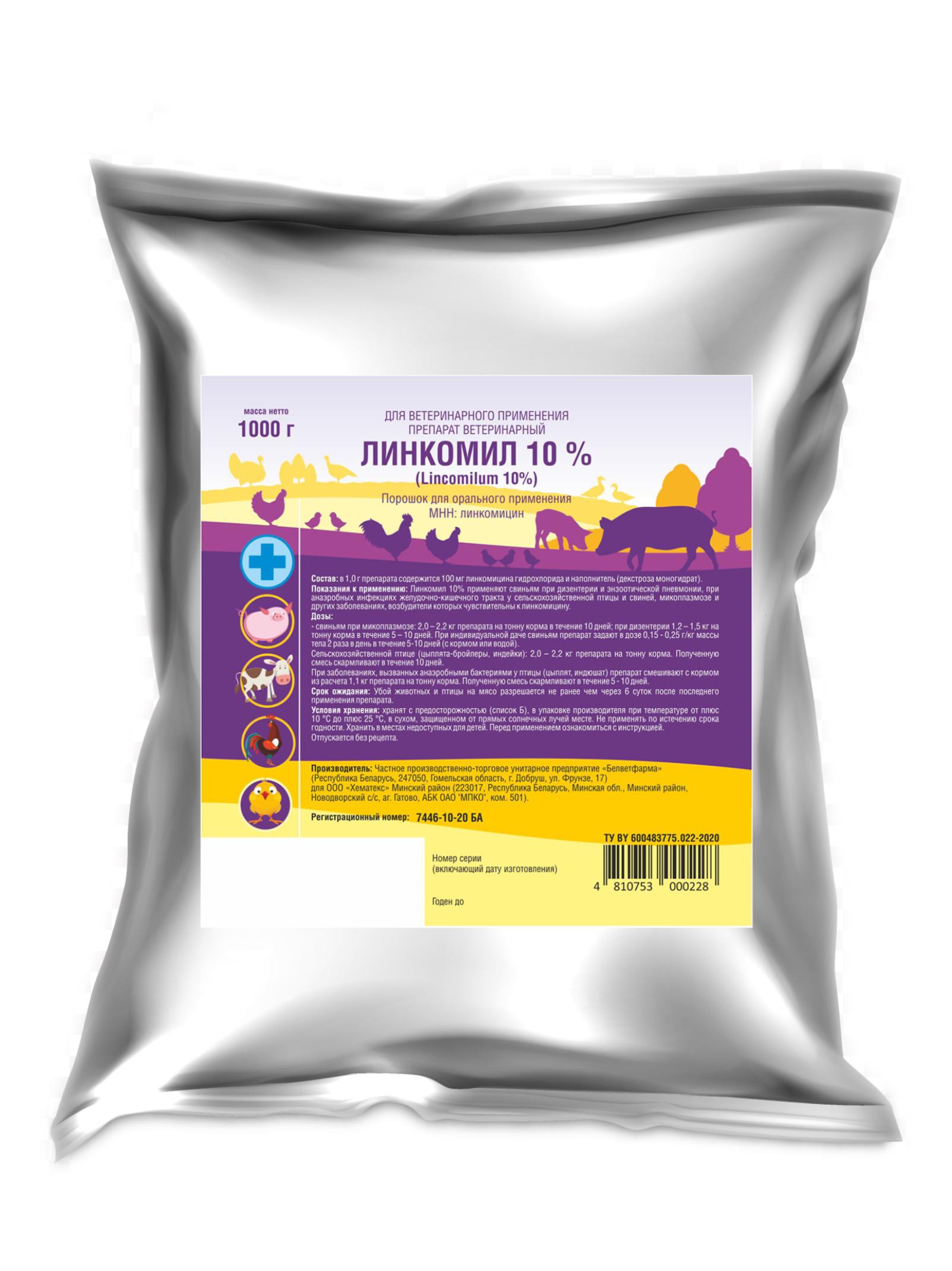 Применяют для лечения и профилактики дизентерии у свиней, при анаэробных инфекциях желудочно-кишечного тракта у цыплят и свиней, при энзоотической пневмонии у свиней, микоплазмозе и других заболеваниях, возбудители которых чувствительны к линкомицину.