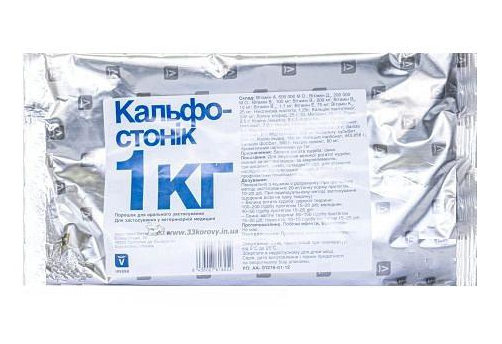 Витамин А — 600 000 ME, витамин D3 — 200 000 ME, витамин B1 — 100 мг, витаминB2 — 200 мг, витамин B6 — 10 мг, витамин B12 — 1,1 мг, витамин Е — 75 мг, витамин К3 — 25 мг, никотиновая кислота — 1,25 г, пантотенат кальция — 500 мг, холинхло рид — 25 г, DL-метионин — 10 г, L-лизин — 2,5 г, корень генциана -5 г, хлоргидрат карнитина — 10 г, глютамат натрия — 7,5 г, хлорид натрия — 25 г, карбонат магния — 5 г, карбонат марганца — 1 г, карбонат цинка — 1 г, сульфат железа — 2 г, сульфат меди — 500 мг, сульфат кобальта — 500 мг, йодид калия — 180 мг, карбонат кальция — 443,865 г, двукальциевый фосфат — 300 г, ароматический наполнитель — до 1 кг.